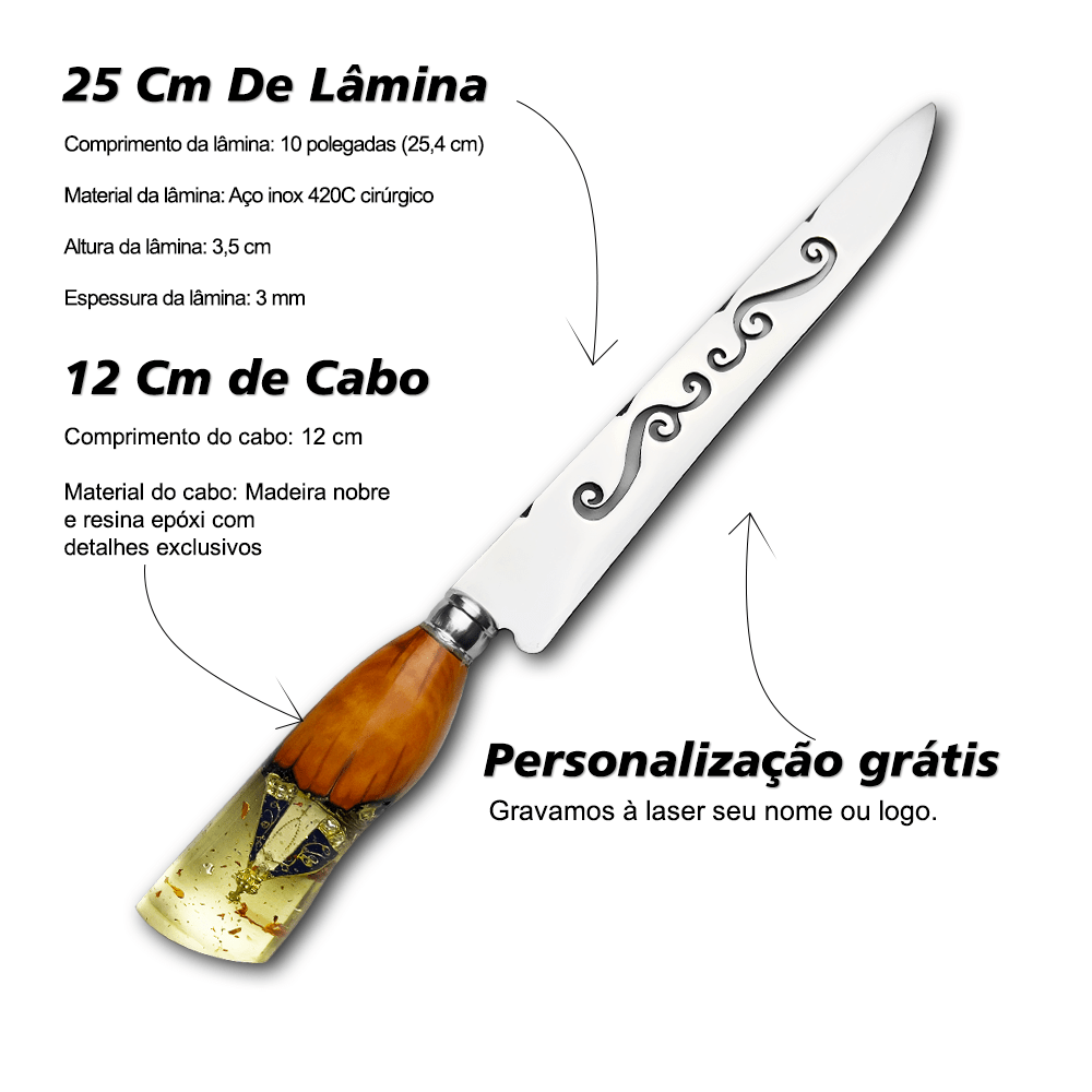 Imagine-se ao redor da churrasqueira, sendo admirado não apenas pelo sabor das carnes, mas também pela elegância da sua faca gaúcha artesanal. Cortes precisos, aparência imponente e a exclusividade do seu nome gravado fazem dela muito mais que um utensílio: uma experiência.